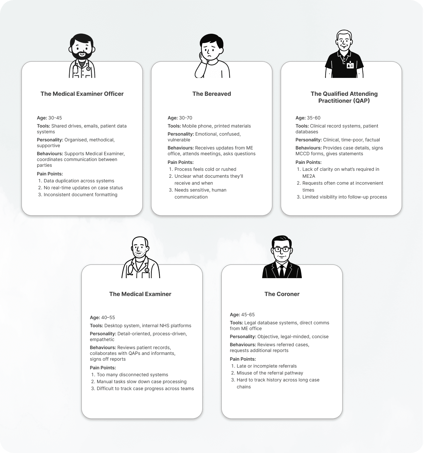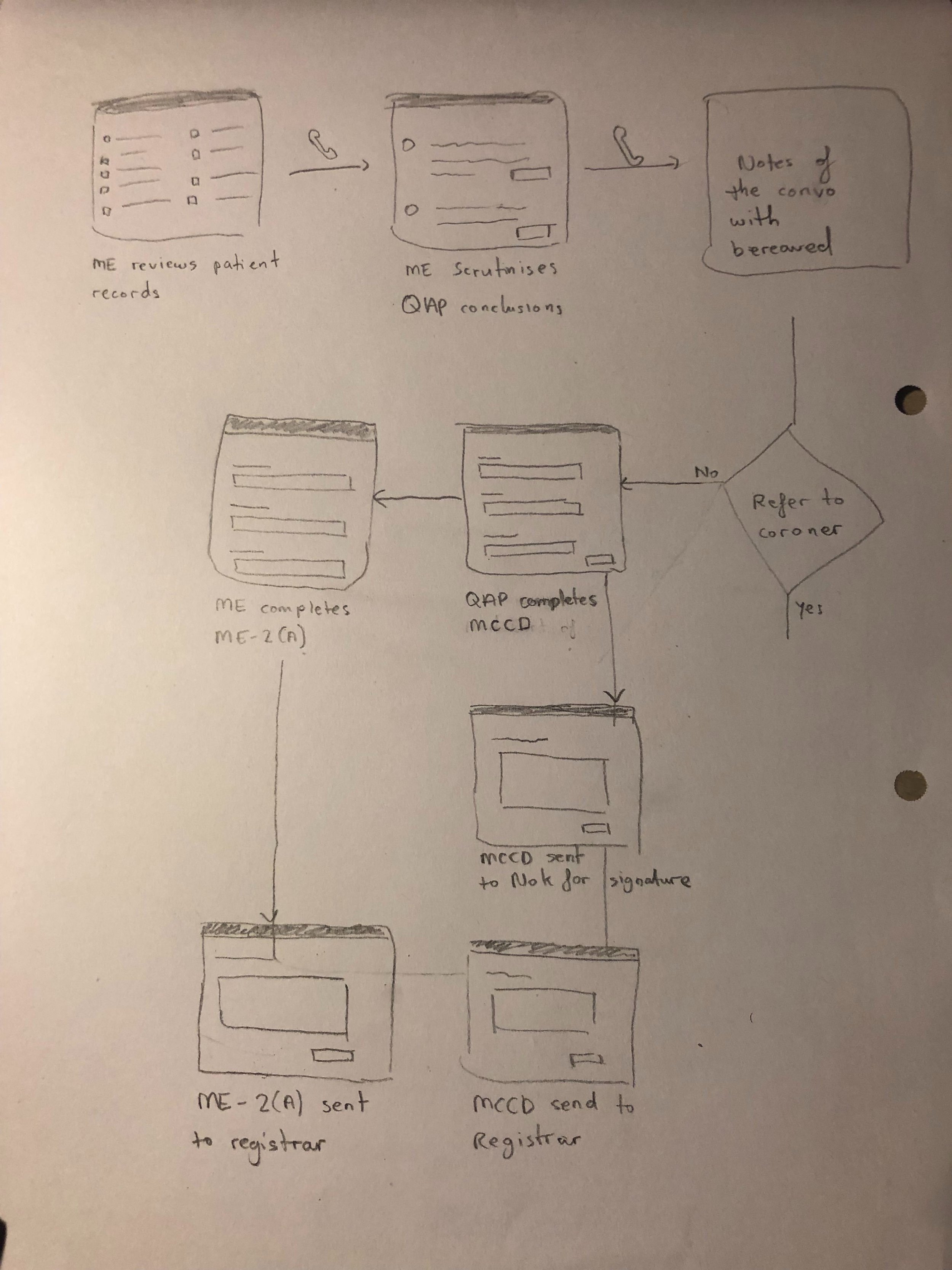 Visualised the end-to-end flow for Medical Examiners and covered additional user types including Medical Examiner Officers, Bereaved, Coroners, and Qualified Attending Practitioners. These flows helped us spot inefficiencies and align interface design with real-world tasks.