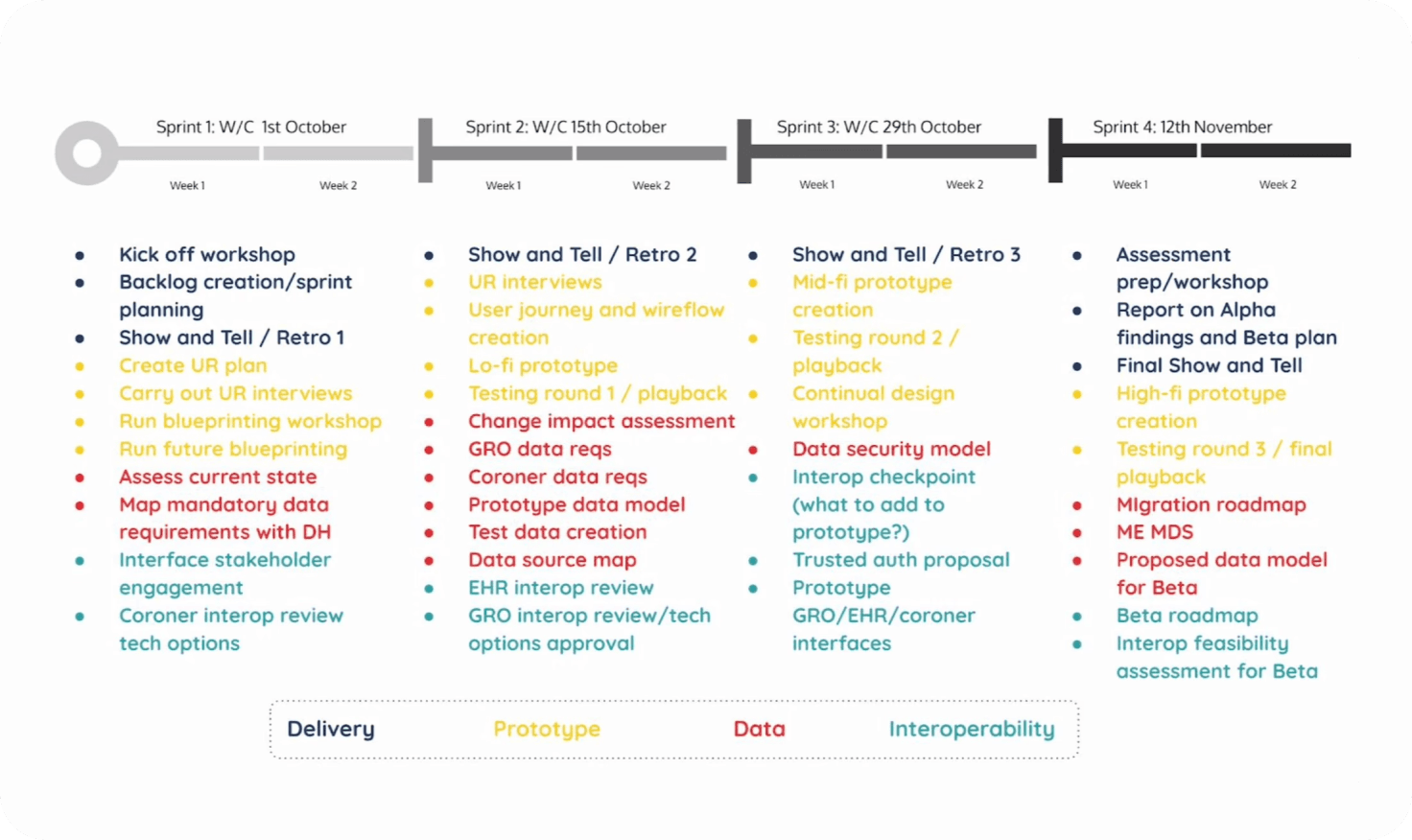 We delivered the Alpha MVS in 4 two-week sprints. Upon completion of Alpha and the GDS assessment, a plan was then created to move on to Beta.